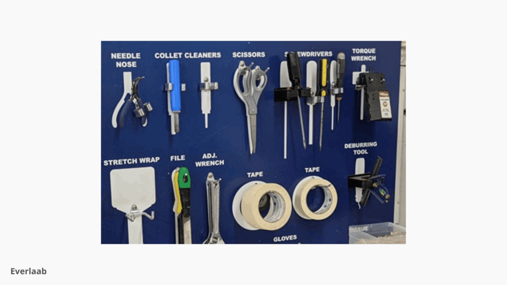 Des shadow boards affichent le contour de chaque outil pour que toute absence saute immédiatement aux yeux et déclenche le réflexe de le remettre en place.